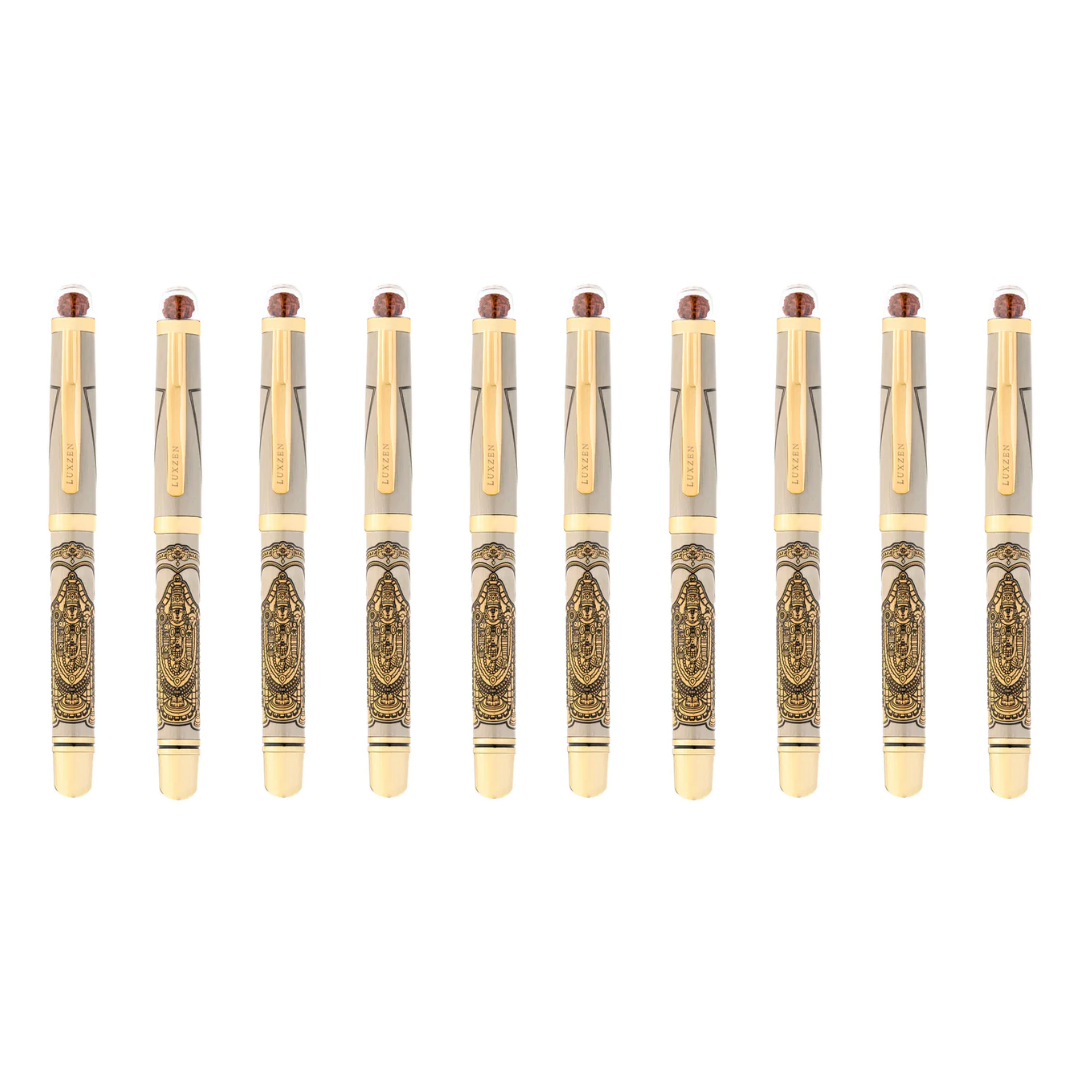 Personalised Sacred Lord Tirupati Balaji Metal Roller Pen with Rudraksh Bead Embed